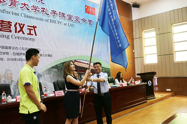 岭师新闻中心讯:5月30日上午,2018白俄罗斯国立体育大学“孔子课堂”夏令营在我校正式开营。21名白俄师生将在我校开展为期十天的中华传统文化体验活动。学校副校长黄崴向白俄罗斯领队老师Natallia Kastseyeva女士授旗并宣布开营。