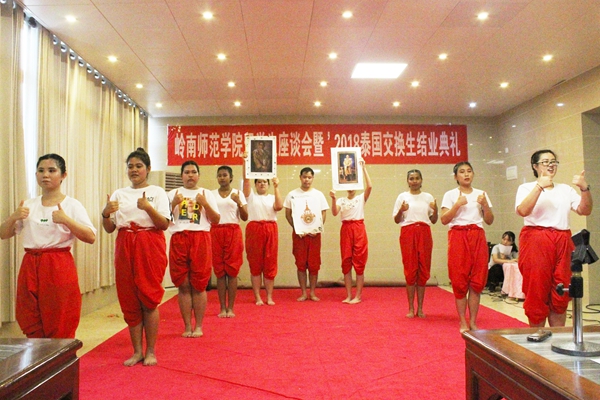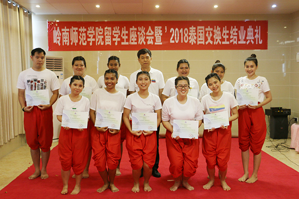 岭师新闻中心讯:“我们学到了许多中国文化,比如太极拳、武术、中国画、中国书法等,我们坚持用汉语说话,谢谢中国朋友,我们很高兴认识你们。”5月28日下午,在岭南师范学院留学生座谈会暨2018年泰国交换生结业典礼上,泰国交换生代表李小慧开心地表达了在岭师学习的喜悦之情。结业典礼在鹏园四楼举行,由我校国际交流与合作处郑志军处长主持。